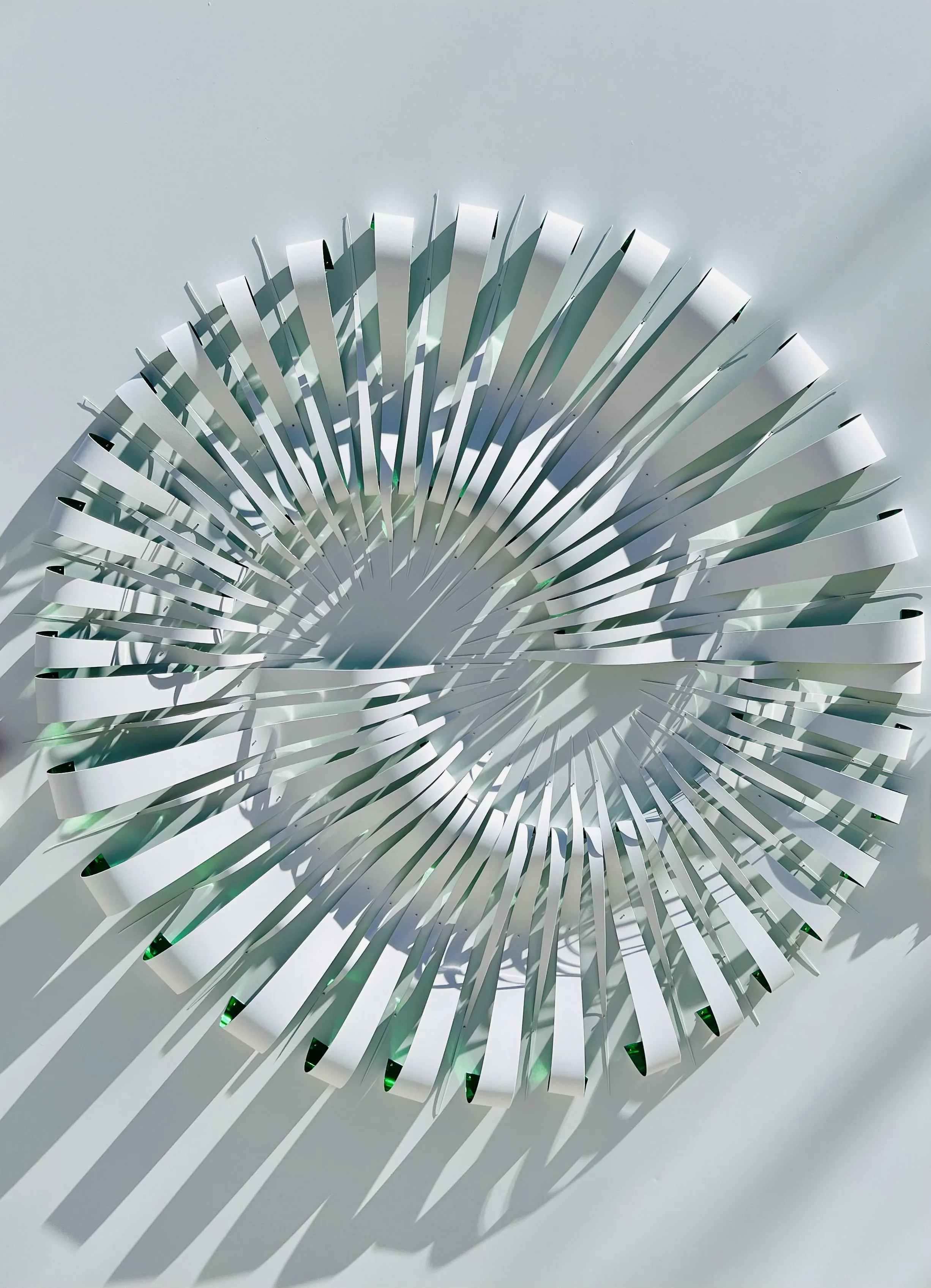 I use, or create, single sided colored paper. In all of my pieces, you are actually looking at the white side of the paper, the color you’re seeing is the reflective color bouncing off of the surface